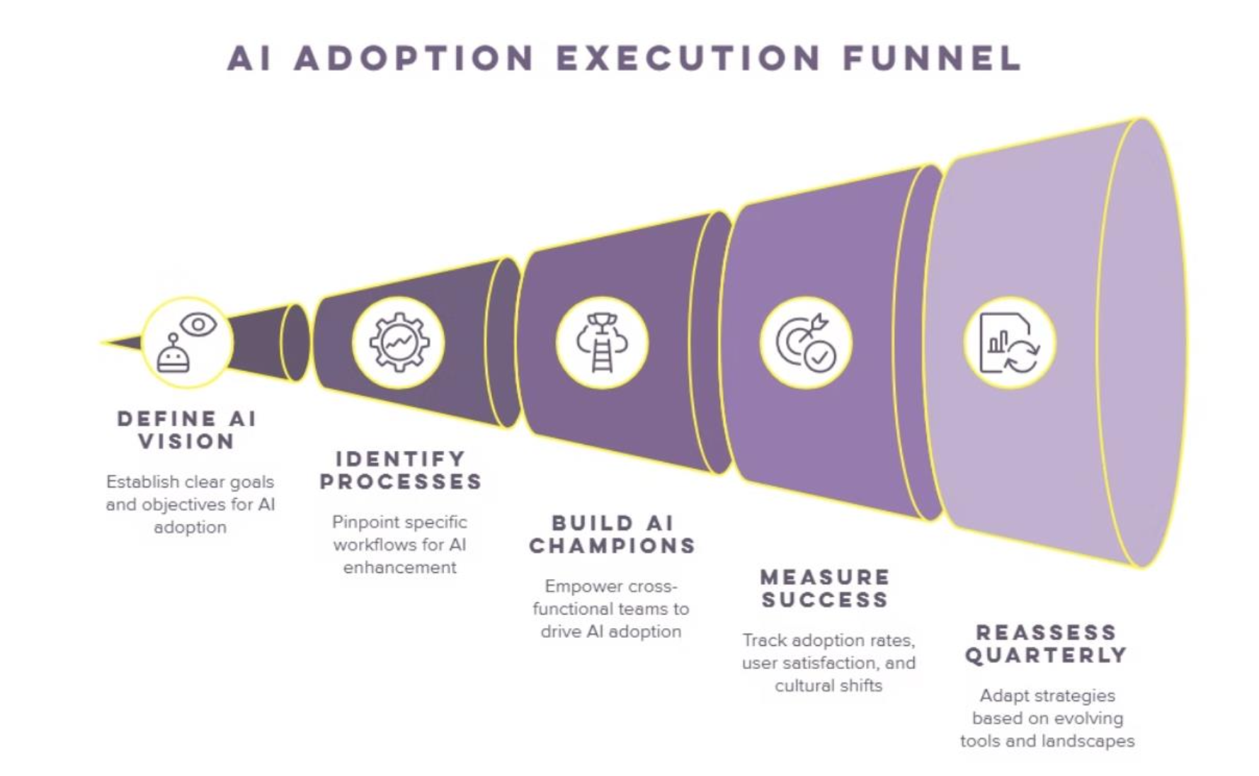 Assess business processes and identify candidates for AI adoption. Why does this matter? This is the “why” you are adopting AI: to deliver business value. A structured approach informs why resources should be diverted and invested.
